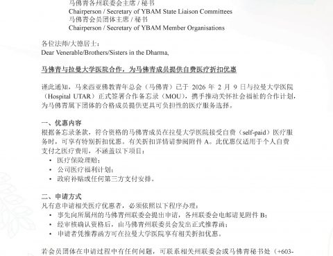 马佛青与拉曼大学医院合作,为马佛青成员提供自费医疗折扣优惠 文告 Statement – 马来西亚佛教青年总会呼吁马来西亚工艺大学修订文化与艺术条规 Young Buddhist Association of Malaysia Calls on Universiti Teknologi Malaysia to Review Its Cultural and Arts Regulations 马佛青第廿八届全国理事会 YBAM 28th National Council (2025-2027) 马佛青行政与训练中心关闭通告 Closure Notice for YBAM Administration and Training Center 马佛青行政与训练中心关闭通告谨此通知马来西亚佛教青年总会将在… 马佛青或转投社团注册法 马佛青招聘启事 YBAM Recruitment Notice 招聘|Hiring ✅行政执行员 Admin Executi… 马佛青总会长杨桂荣2025年卫塞节献词 征求助印《马佛青55周年》纪念特刊 行脚僧霹雳站 20至21日行程公布 36行脚僧抵实兆远 明南下安顺 Page 1 of 181 2 3 … 18 Next