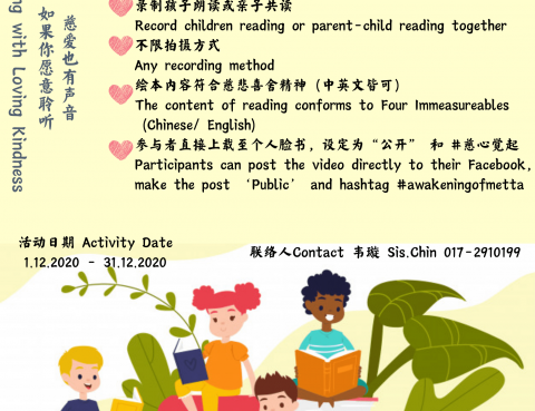 慈心觉起系列之绘本朗读爱 | Reading aloud with love 01.12 – 31.12.2020 以单纯的童声,朗读一则慈爱的故事,慈爱也有声音,如果你愿意听。 Hearing the loving kindness story from a child.